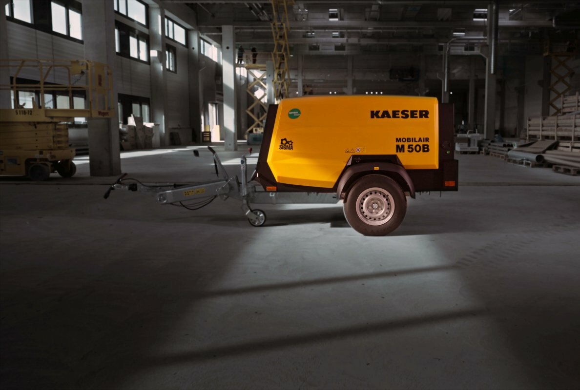 德國Kaeser Kompressoren 在 INTERMAT(歐洲機械大展) 上推出了電池供電移動式空壓機 M50B 的研究,展示了其無限電力功能。